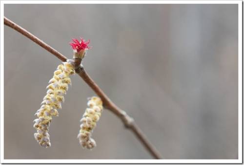 Орешник образует мужские цветки, или сережки, и женские цветки.