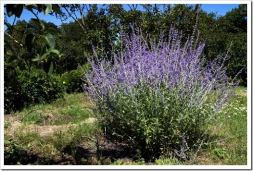 В период с июля по октябрь русский шалфей радует садовода обилием сине-фиолетовых цветков.