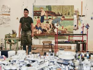 Я просто рисую их портреты”, - добавляет он. “Это настолько раскрепостило меня, что, возможно, именно поэтому я продолжаю серию так долго, потому что это открыло новые возможности”. Все художники, изображенные на картинах Баса, зациклены на своеобразных творческих исканиях. На одной из них художник мастерит шкатулку из использованных палочек от эскимо, на другой он перекрашивает комнату в цвет года, соответствующий Pantone.